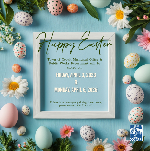 Easter Hours Town of Cobalt March 29, 2026 Latest News Post navigation Previous Previous post: SPECIAL MEETING COBALT COMMUNITY HALL March 10, 2026 at 2:30 p.m.Next Next post: Press Release – Budget Passing
