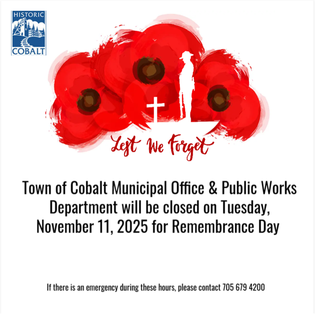 Remembrance Day Closure Town of Cobalt November 7, 2025 Latest News Post navigation Previous Previous post: Surplus LotsNext Next post: Cobalt Regular Council Meeting – Wednesday November 12th , 2025 – 6:30 pm.